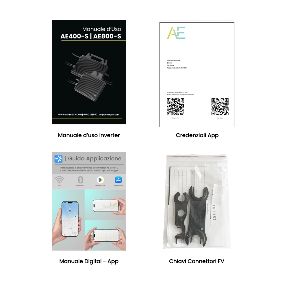 - 1x Inverter Smart AE800-S: Potenza nominale 800W. Gestisce l’energia in modo intelligente per massimizzare l’autoconsumo. Risponde a tutte le normative di sicurezza in Italia e in Europa (CEI 0-21, CE, ecc). Cavo di connessione CA: 3 metri.